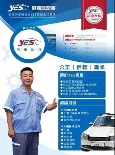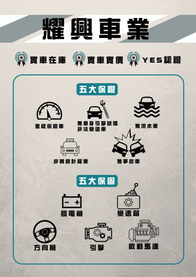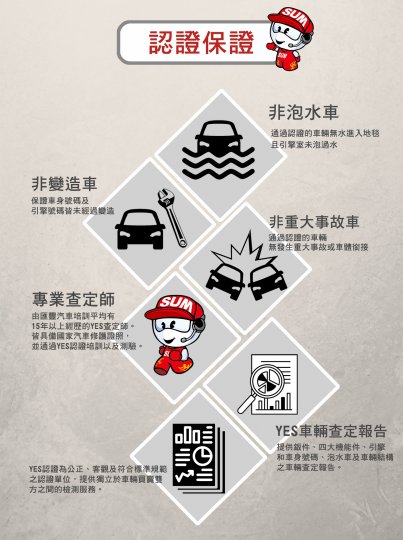 車輛保證為里程保證車、無泡水車、無重大事故車、無車身引擎號碼變造車、非黃底計程車