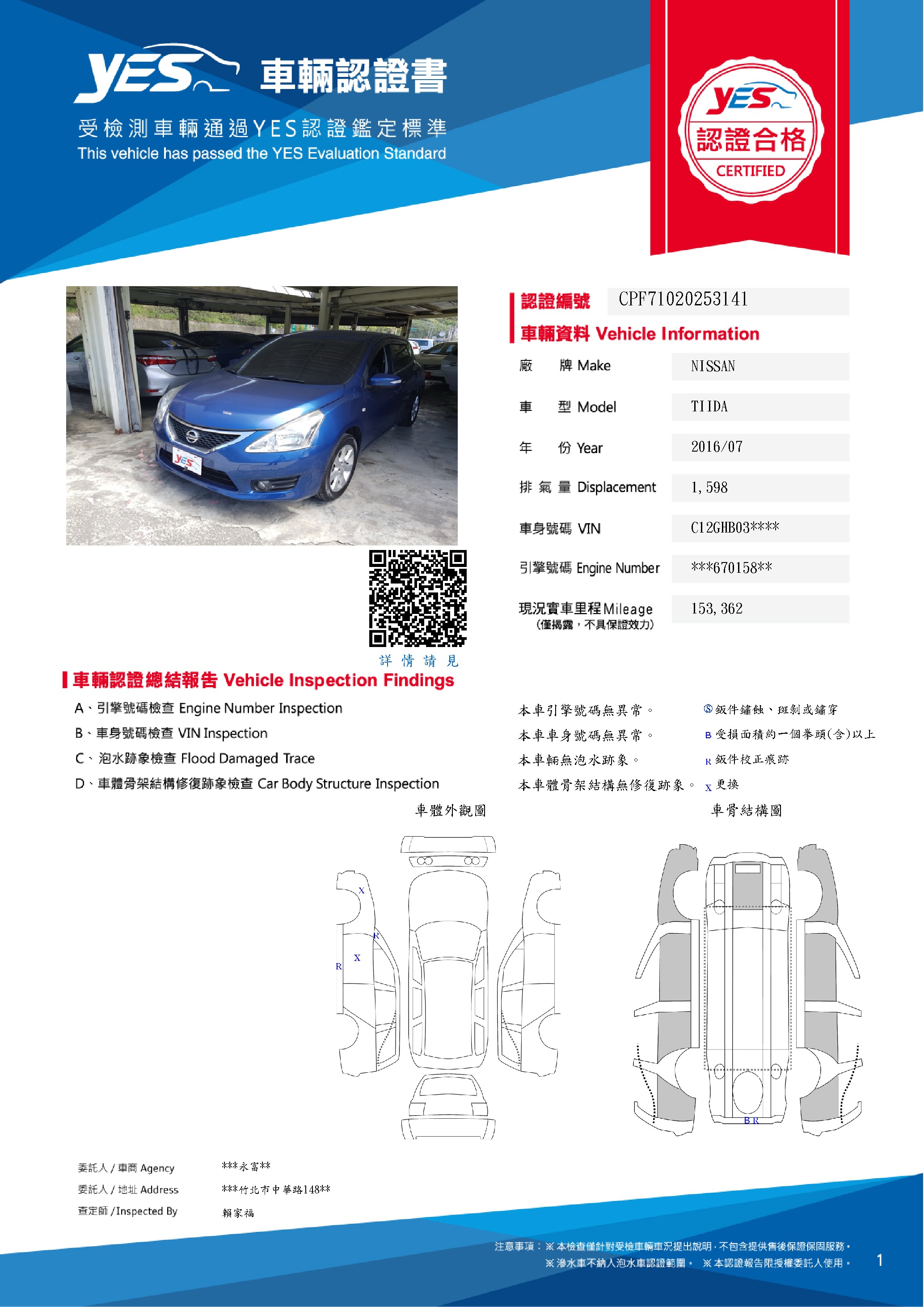 本車已由YES專業查定師完成 153 項檢測